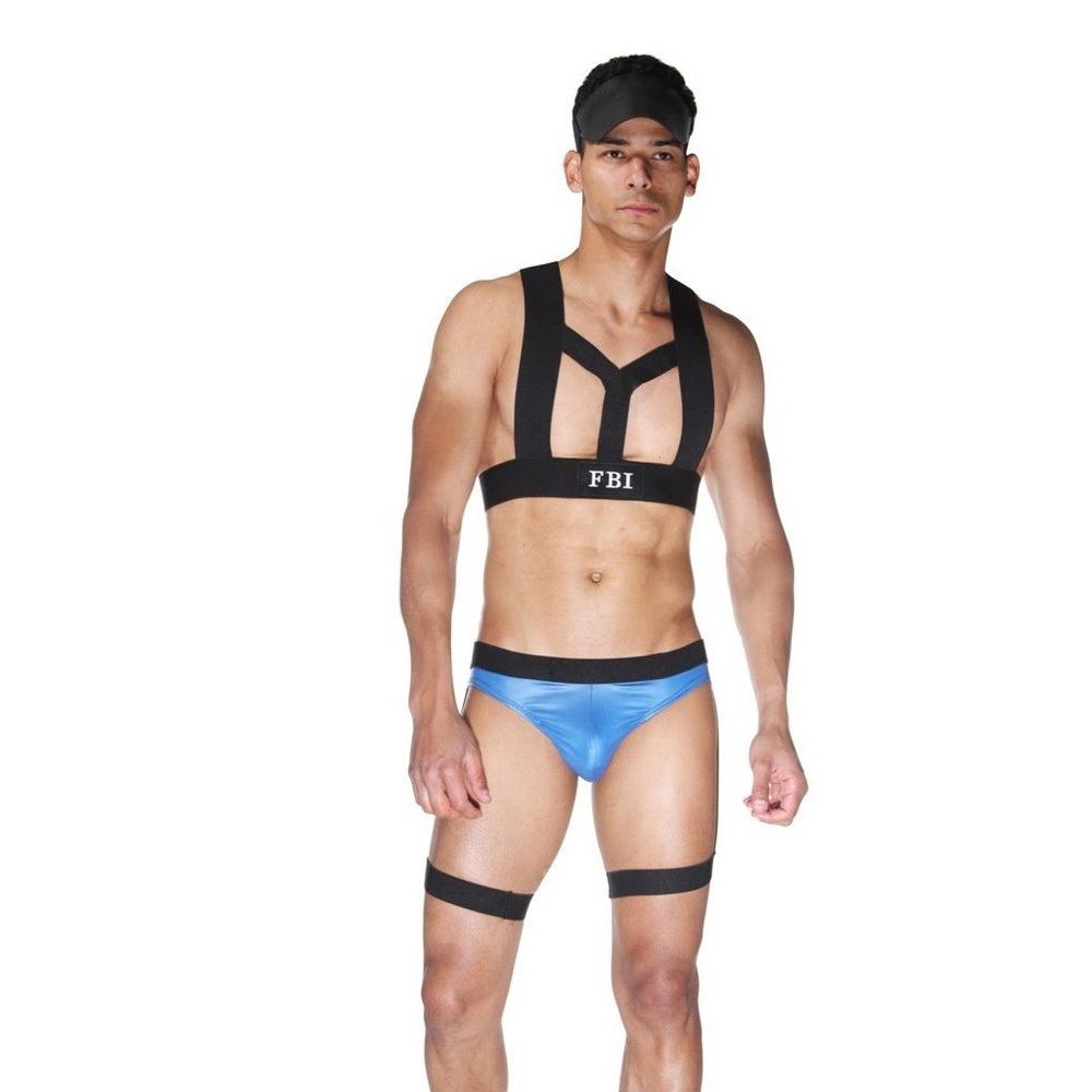 Ролевой костюм агента FBI для мужчин из трех предметов. Черный козырек, топ из широких черных ремней и синих трусов с черным поясом и подтяжками. В комплекте: козырек, трусы-слипы с гартерами, топ.