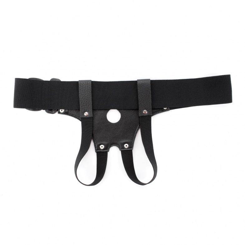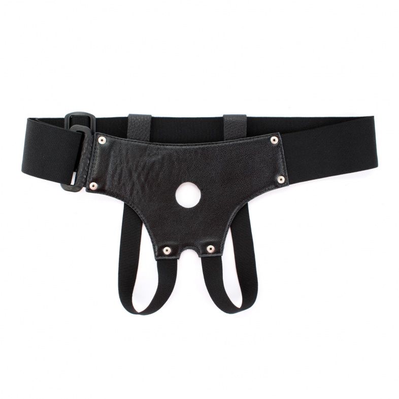 Трусики для страпона, изготовлены из кожи, имеют отверстие-доступ в области бикини. Крепятся при помощи широких эластичных лент. Размер легко меняется при помощи застежки. Диаметр отверстия для страпона - 2,5 см.