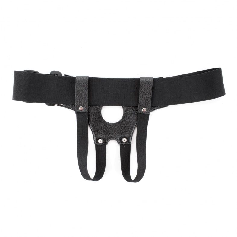 Трусики для страпона, изготовлены из кожи, имеют отверстие-доступ в области бикини. Крепятся при помощи широких эластичных лент. Размер легко меняется при помощи застежки. Диаметр отверстия для страпона - 4 см.